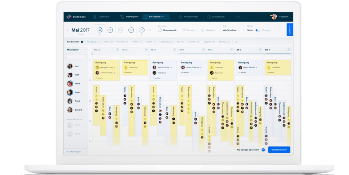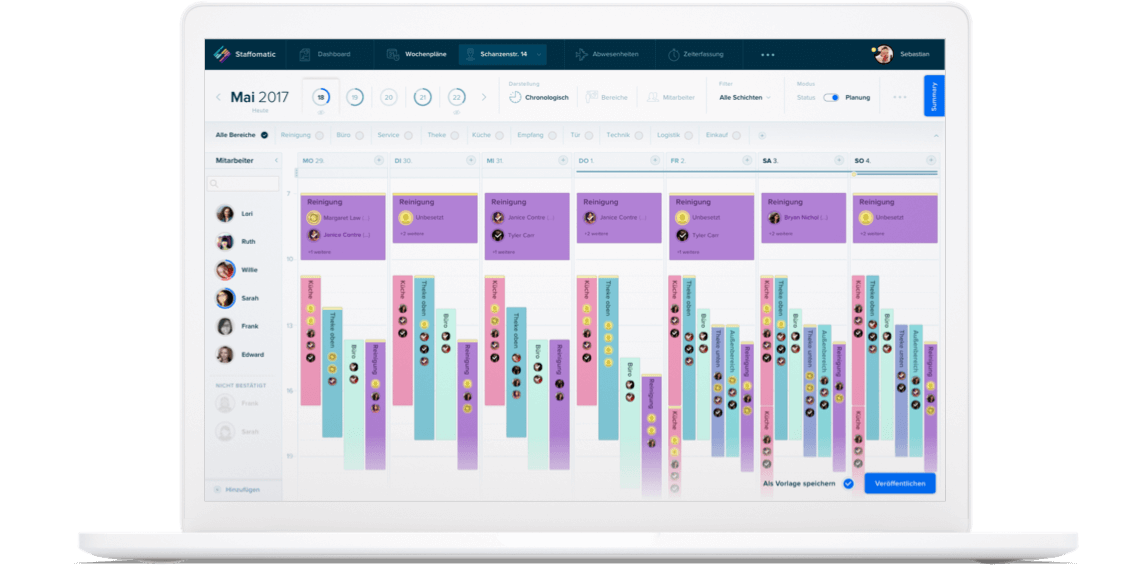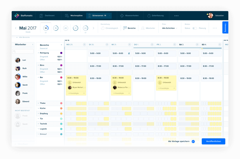 Mit Staffomatic kann man einfach und effektiv Dienstpläne erstellen. Besonders Komplex war hier insbesondere das Handling vieler Schichten und verschiedener Bereich in übersichtlichen Screens.
