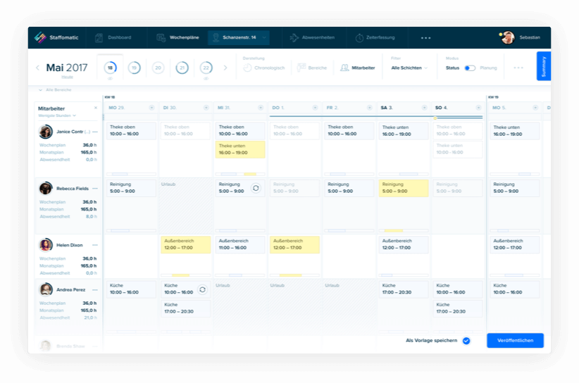 Um den Manager die Arbeit zu erleichtern, kann man die offenen Positionen auch direkt aus der Übersicht mit passenden Mitarbeitern belegen. Über einen smarten Algorithmus werden die passensten Mitarbeiter bereits vorgefiltert angezeigt. So kann man sich in vielen Fällen den Umweg über die Details sparen.